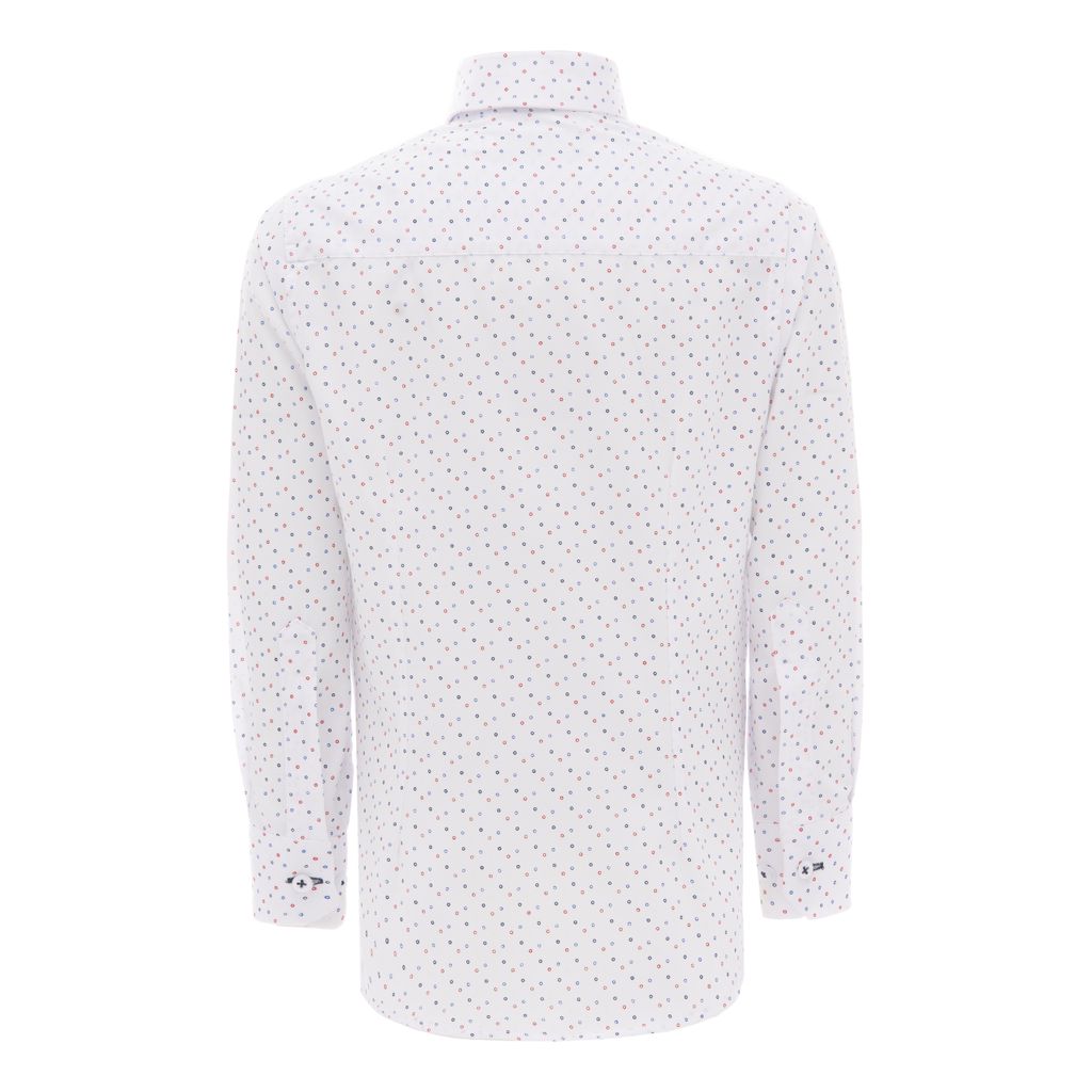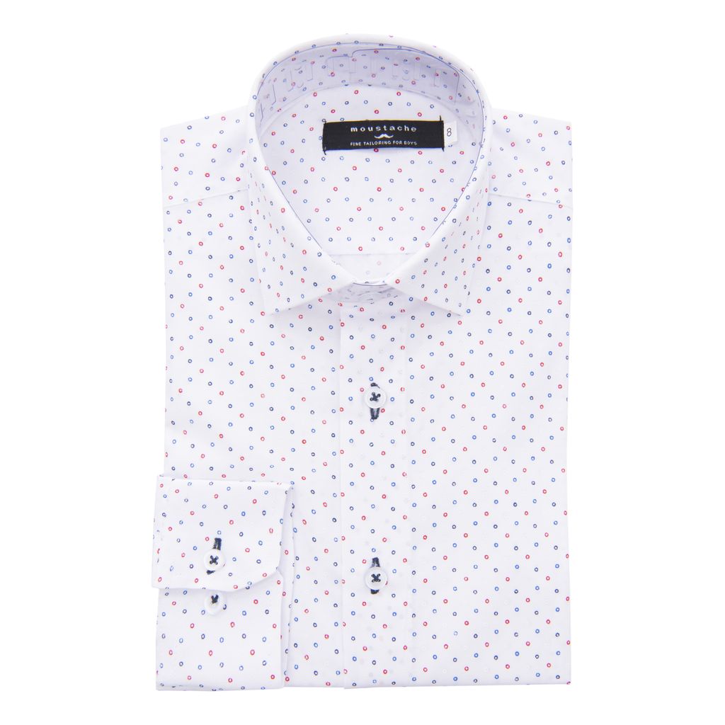 Dress your kid in style with Moustache's White Mini Circle Print Dress Shirt. This shirt features an allover mini circle print in blue and red, adding a playful yet sophisticated touch. Made from 100% organic cotton, this shirt is lightweight and comfortable, perfect for any occasion.