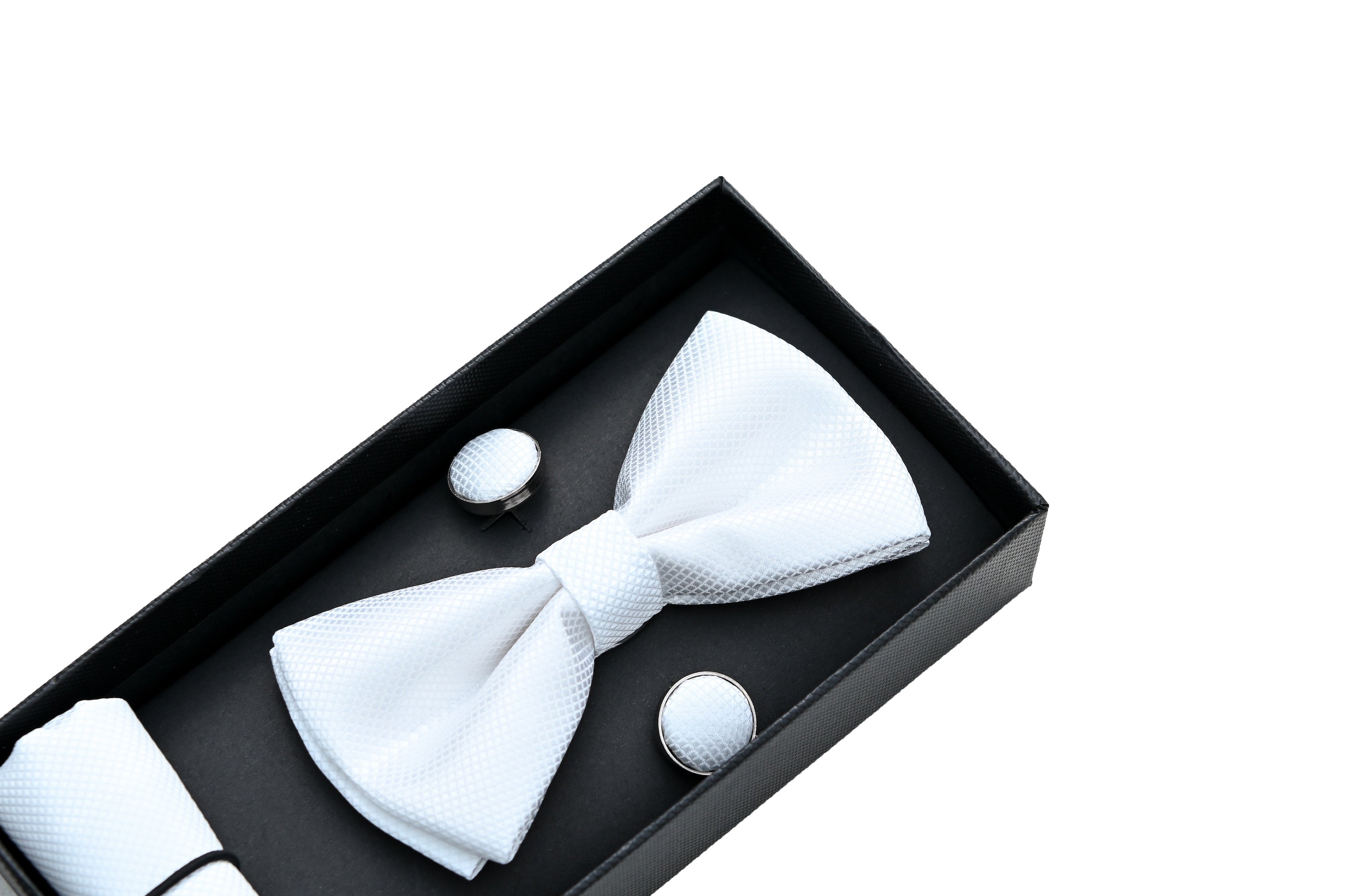 The bowtie showcases a pristine white fabric with a distinctive crosshatch pattern, adding depth and refined detail to any outfit. When paired with the matching cufflinks and pocket square, this set creates a polished, cohesive look that radiates pure sophistication.