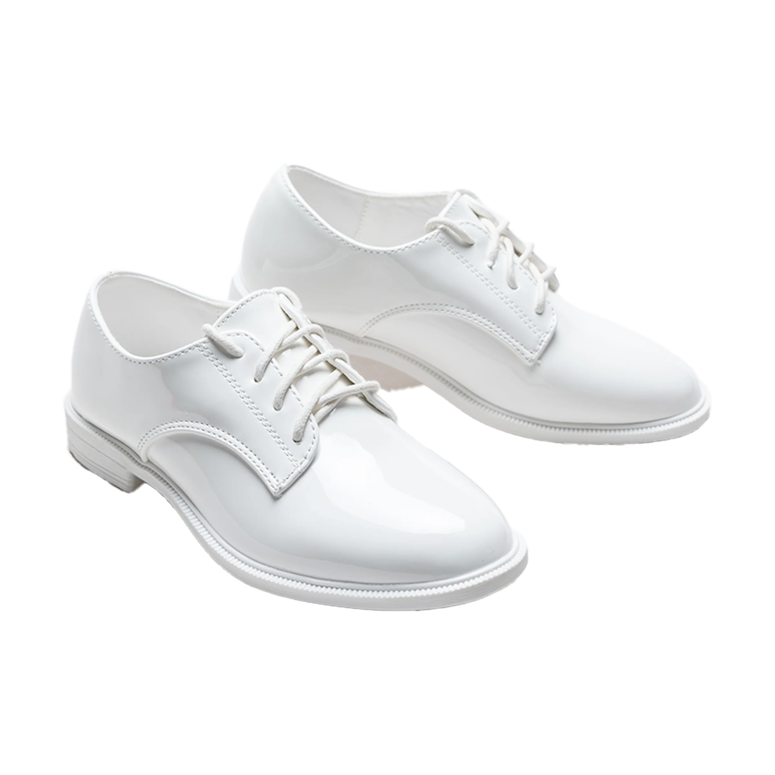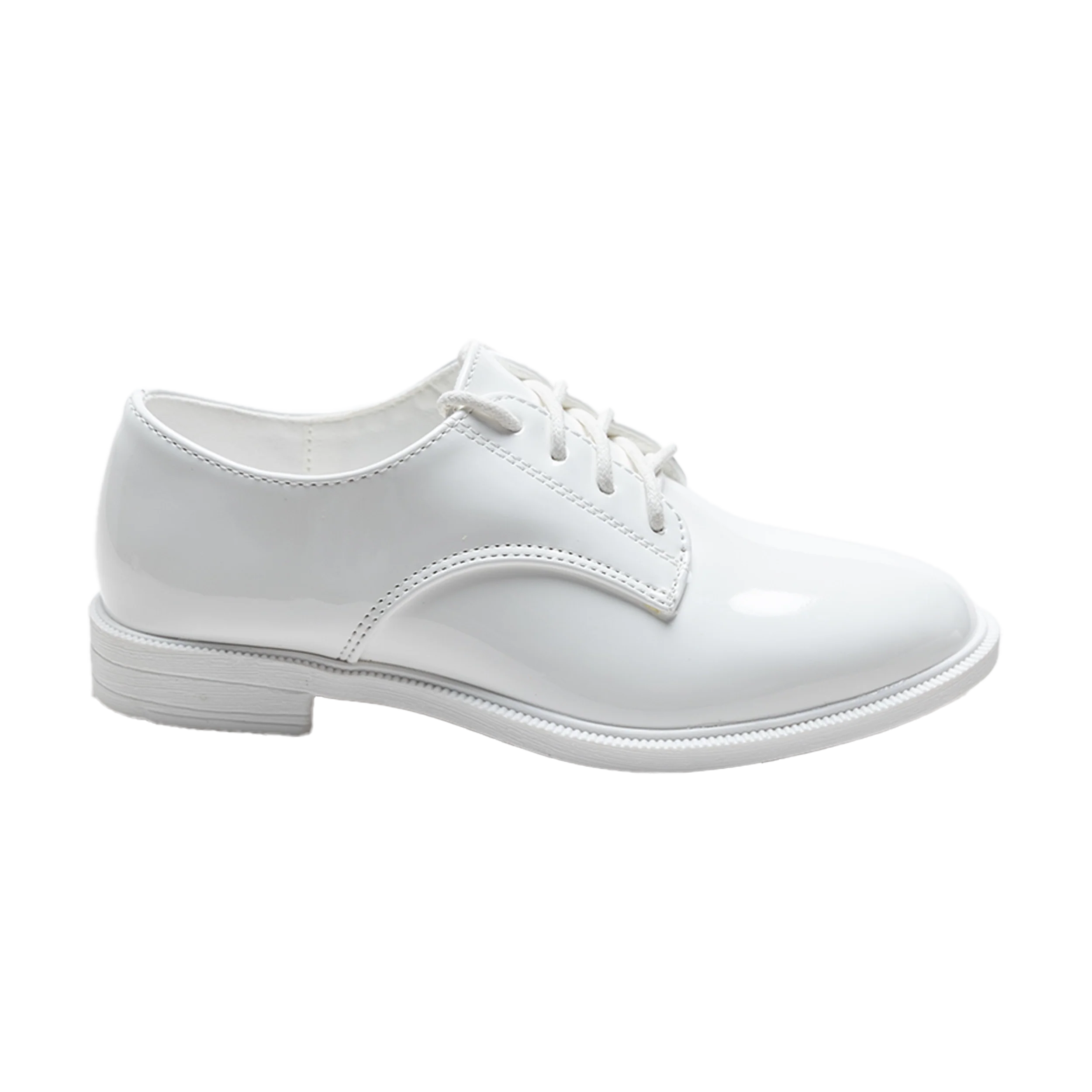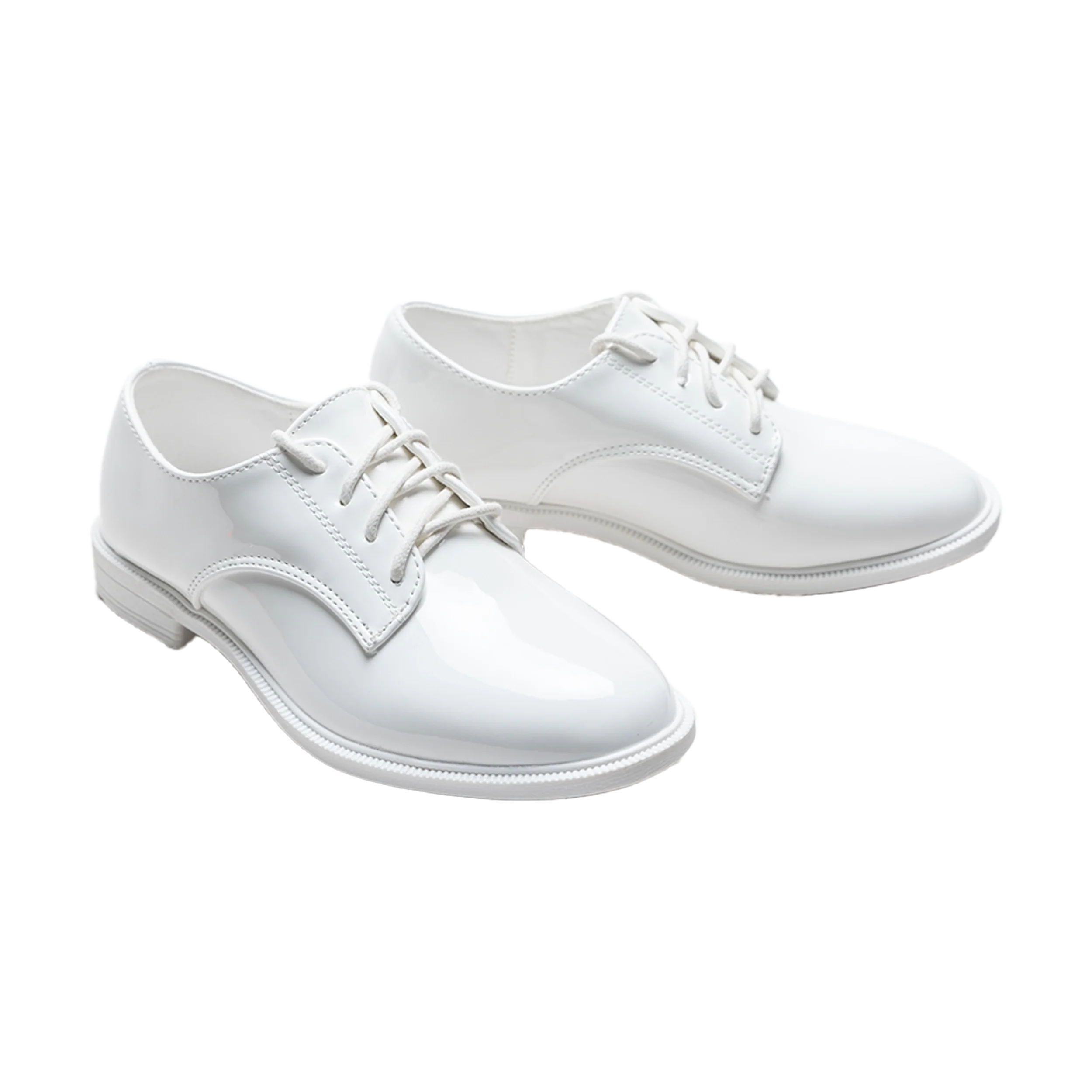 The classic laced design not only adds a refined touch but also ensures a secure and comfortable fit. The bright, shiny white finish gives these shoes a standout quality, enhancing any outfit with a touch of brilliance and class.