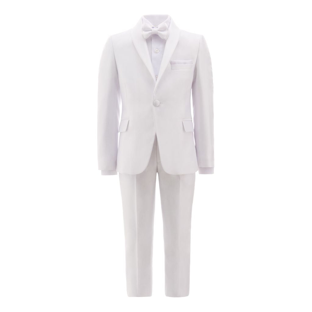 Dress your kid in style with Moustache's White Shawl Lapel Suit. This set includes a white classic dress shirt, a white shawl lapel blazer, formal straight trousers, and a classic white bow tie, making it the perfect ensemble for any special occasion.